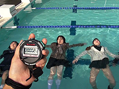 冬服浮力競技 制服水泳大会第四種目。冬服のままで浮力競争。4人同時に水中に浮かび、どれだけ浮いていられるか競います。みんな徐々に足が下がっていっています。水を含んだ重たい冬服で一生懸命頑張っております。 ※本編中、映像が...