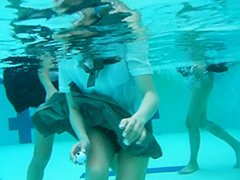夏服BOUNS GAME 制服水泳大会第九種目夏服のままプールにあるボール拾い。ポイントが多く書いてあるボールを拾って高得点GET。夏服は、びしょ濡れになり、ブラジャーも透けて見えちゃいます。プールの中では、スカートがひ...
